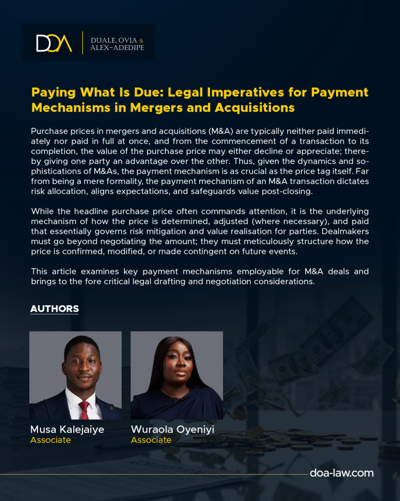 In our latest MAPE article, Musa Kalejaiye and Wuraola Oyeniyi explore the legal imperatives for structuring payment mechanisms in mergers & acquisitions and what dealmakers must keep in mind to get them right.